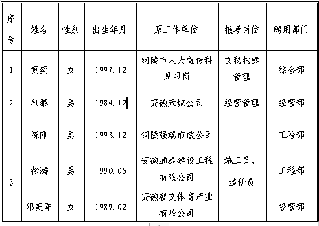 根據(jù)《銅陵市綜合投資集團有限公司(華越建設(shè)工程公司)公告》,現(xiàn)將相關(guān)崗位擬聘用人員名單公示如下: