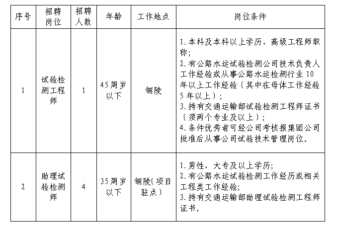 銅陵市綜合交通投資集團(tuán)有限公司司屬全資子公司銅陵市華信工程質(zhì)量檢驗(yàn)有限責(zé)任公司因經(jīng)營發(fā)展需要,現(xiàn)面向社會(huì)公開招聘若干名工作人員,現(xiàn)將具體事項(xiàng)公告如下: