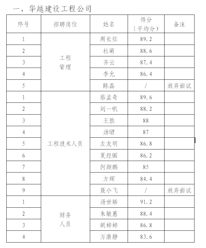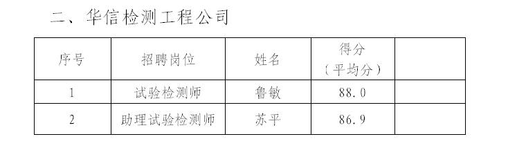 根據(jù)《銅陵華越建設(shè)工程有限公司公開招聘人員公告》、《銅陵市華信工程質(zhì)量檢驗有限責(zé)任公司公開招聘人員公告》,于3月1日開展招聘人員面試工作,現(xiàn)將擬招錄人員公示如下: