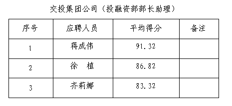根據《銅陵市綜合交通投資集團有限公司公開招聘人員公告》,我公司已于2022年3月9日開展銅陵市綜合交通投資集團有限公司投融資部部長助理面試工作,現將報名參與人員面試成績公示如下: