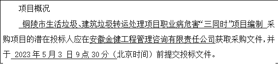 采購需求:銅陵市生活垃圾、建筑垃圾轉(zhuǎn)運處理項目職業(yè)病危害“三同時”項目編制,詳見招標(biāo)文件項目需求內(nèi)容。