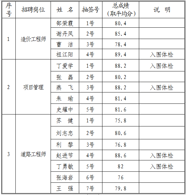 將交投集團公司造價工程師、項目管理、道路工程師崗位招聘體檢入圍人員名單公示如下: