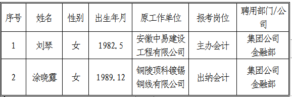 根據(jù)《銅陵市交通投資有限責(zé)任公司招聘人員公告》,現(xiàn)將出納會(huì)計(jì)、主辦會(huì)計(jì)擬聘用人員名單公示如下: