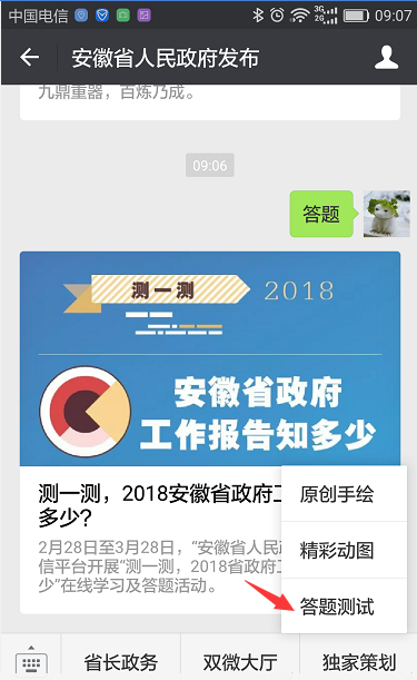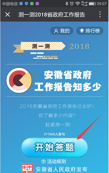 根據(jù)市政府辦公室文件通知要求,扎實做好2018省政府工作報告學(xué)習(xí)貫徹工作,定于2月28日至3月28日,通過“安徽省人民政府發(fā)布”微信平臺開展“測一測,2018省政府工作報告知多少”在線學(xué)習(xí)及答題活動。